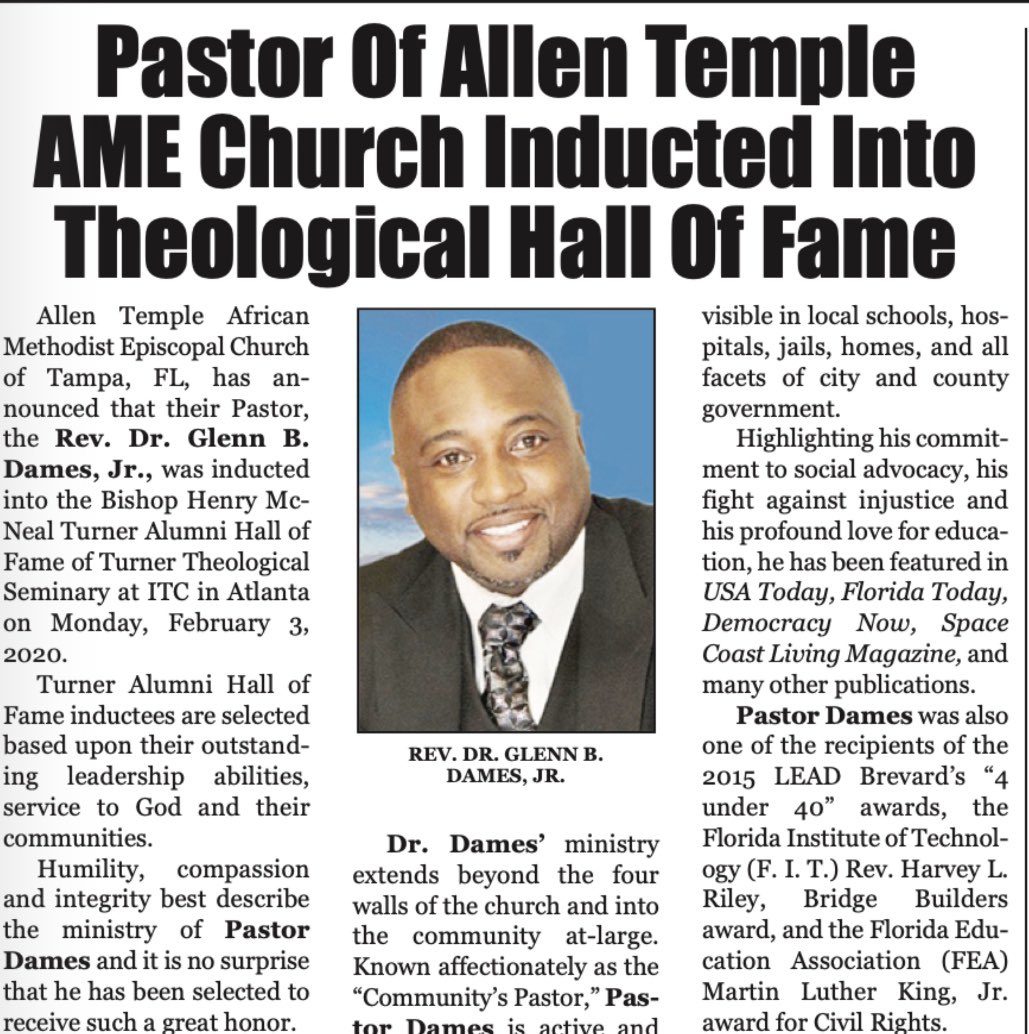 Reverend Glenn Dames. Pastor of St. James AME Church in Titusville, Florida. He is also president of the North Brevard Ministerial Alliance and former ...