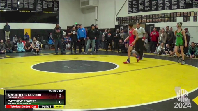 100 lbs Cons. Round 2 - Aristoteles Gordon, Carnegie Scots vs Matthew Powers, Barrett Middle School. View All Northern California TOC 2024.