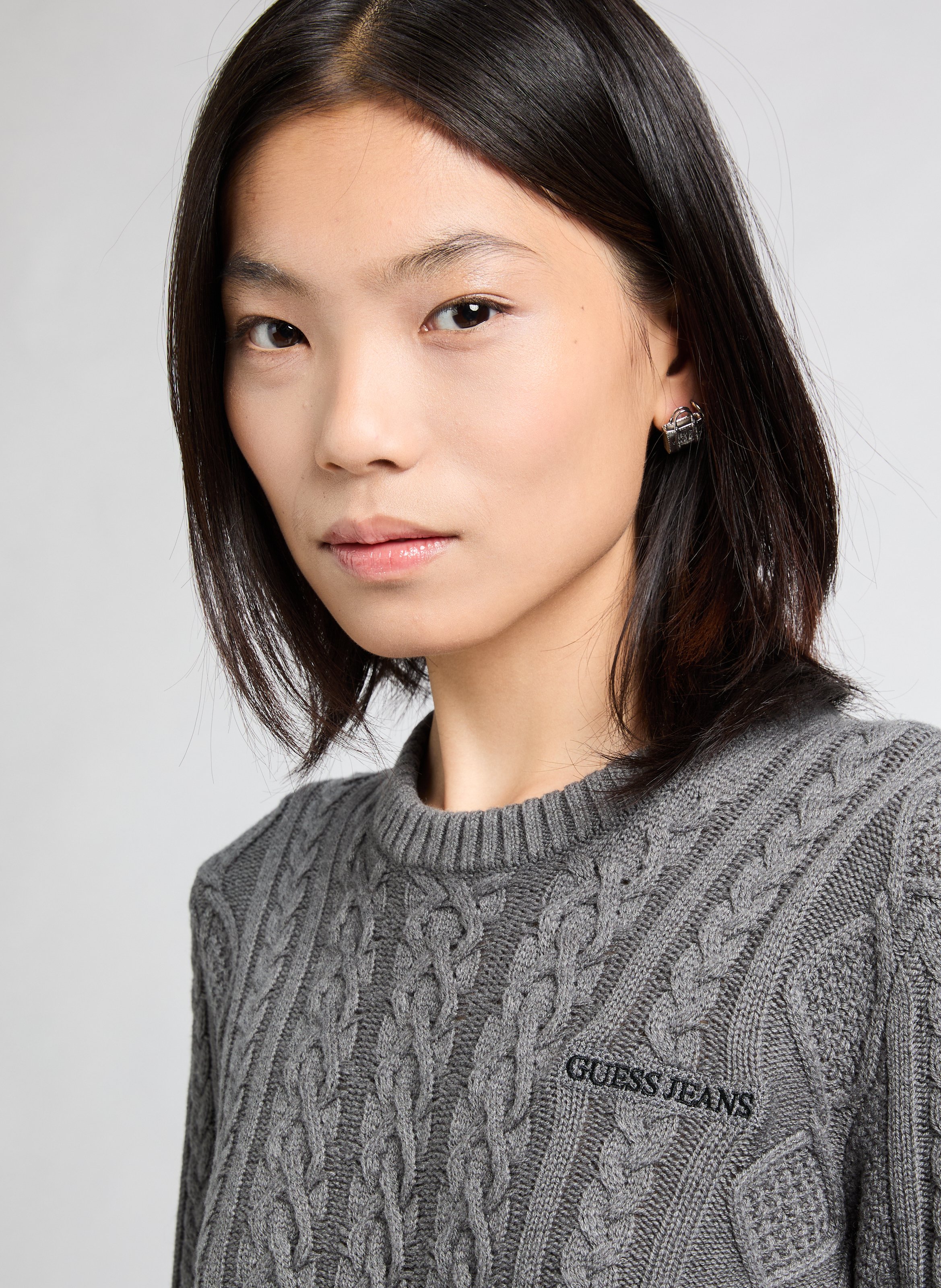 Heather Cable Sweater | Light Blue · Made in Italy. · Model is 5'10. · 62% Acrylic, 18% Polyester, 8% Viscose, 8% Wool, 4% Alpaca.