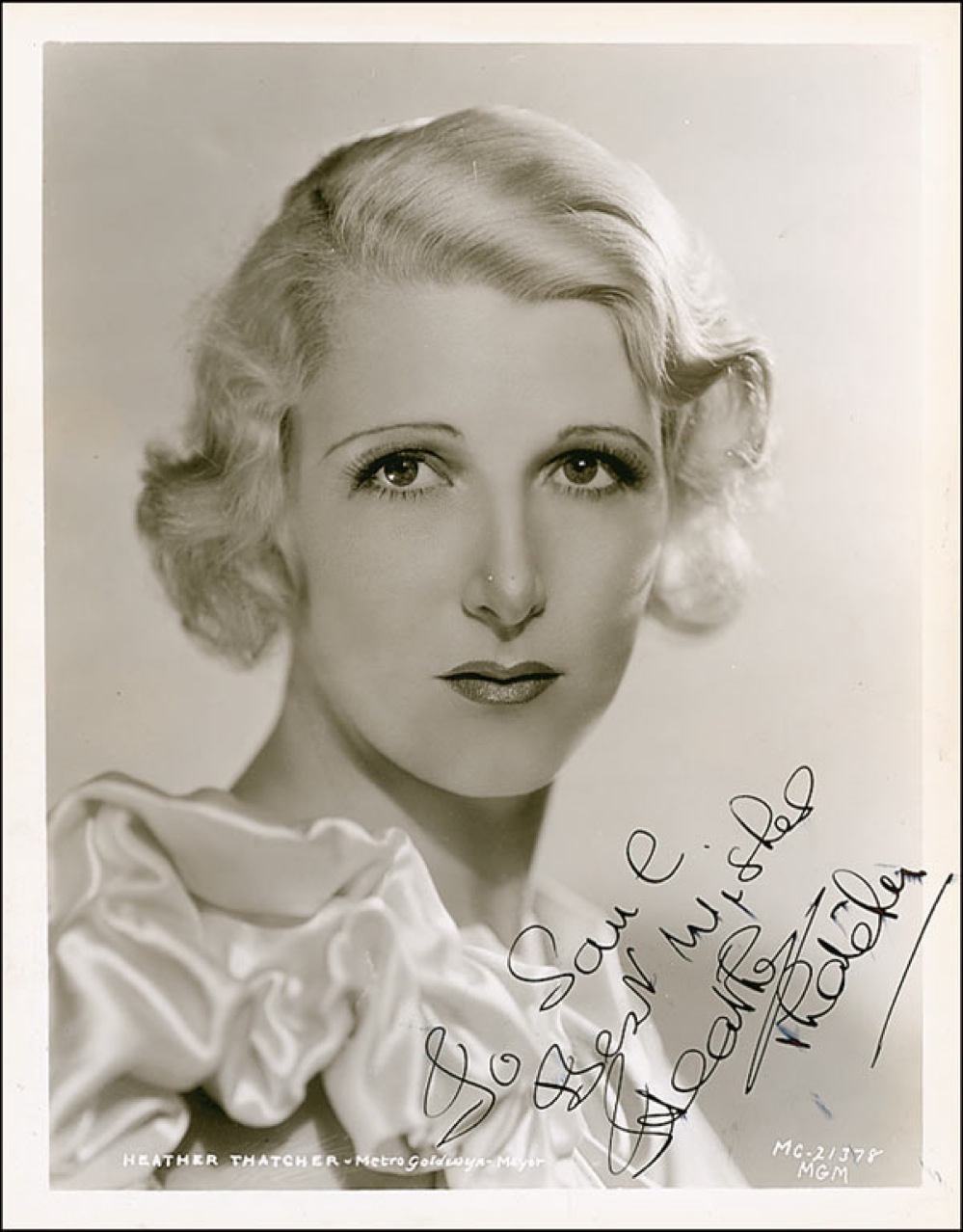 Sold for $164 | Vintage glossy 8 x 10 MGM publicity photo, signed and inscribed in-person in fountain pen “To Saul, Best wishes, Heather Thatcher.”