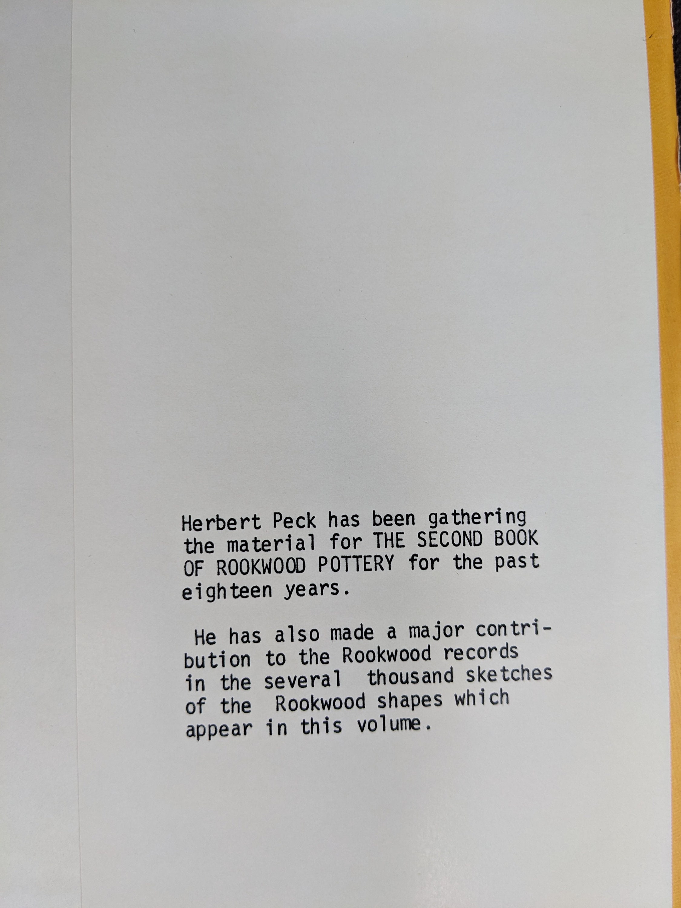 Second Book of Rookwood Pottery. Herbert Peck Books. First Edition. Hardcover. Very Good / Good. Item #336551. ISBN: 999677953X