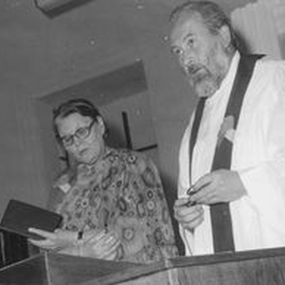 West Bengal, Nordindien. Fra indvielsen af Narainpur Kirke, 1971. Missionær Inger Krogh Nielsen (tv) tolker Irene Gravs tale West Bengal, North India.