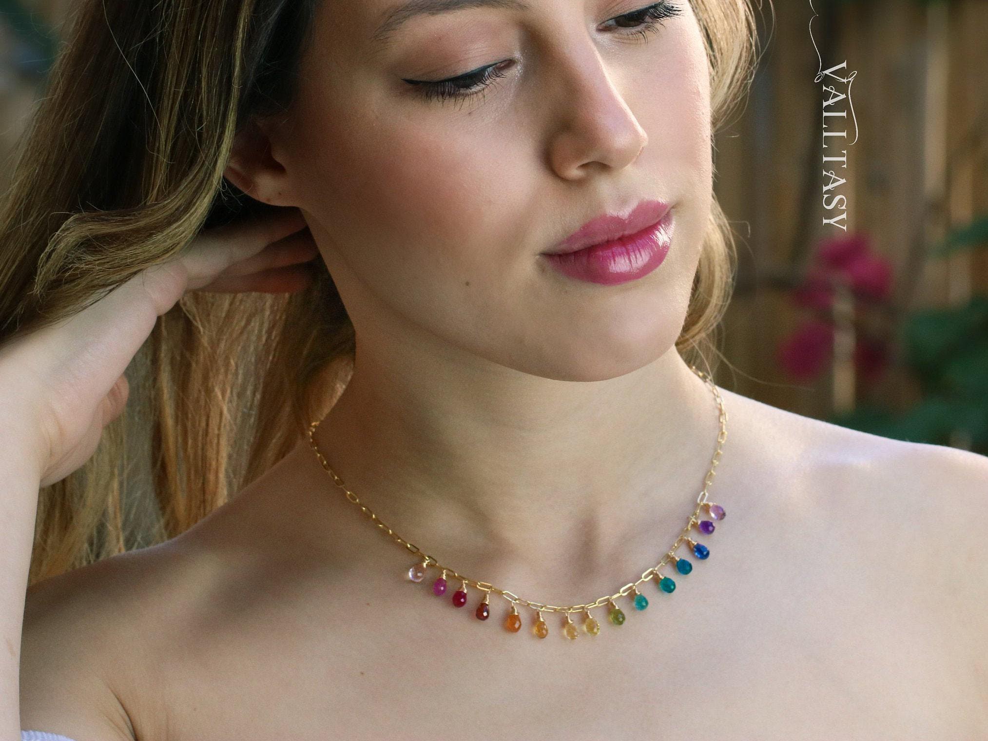 Collar de briolettes de turmalina arco iris, cadena de plata chapada ...