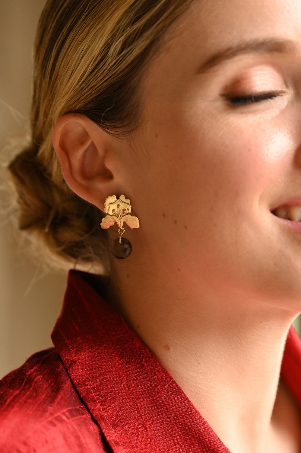 The Iris, a symbol of messages and communication, bridges these timeless truths. 18K Gold-plated Iris Stone Small Earrings. Length: 3 cm. Stones: Pink Amethyst.
