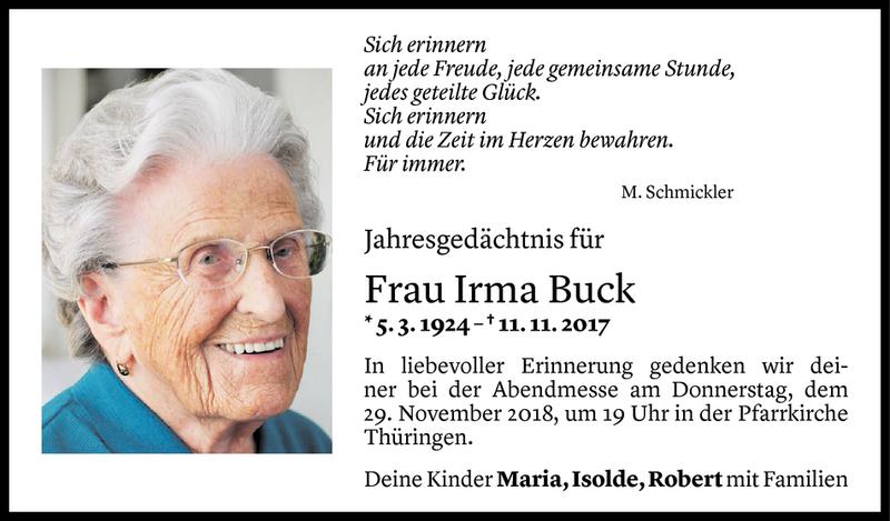 Irma Buck Obituary ... Irma was born on April 15, 1925 and passed away on Monday, February 4, 2013. Irma was a resident of Palm Springs, California. To plant a ...
