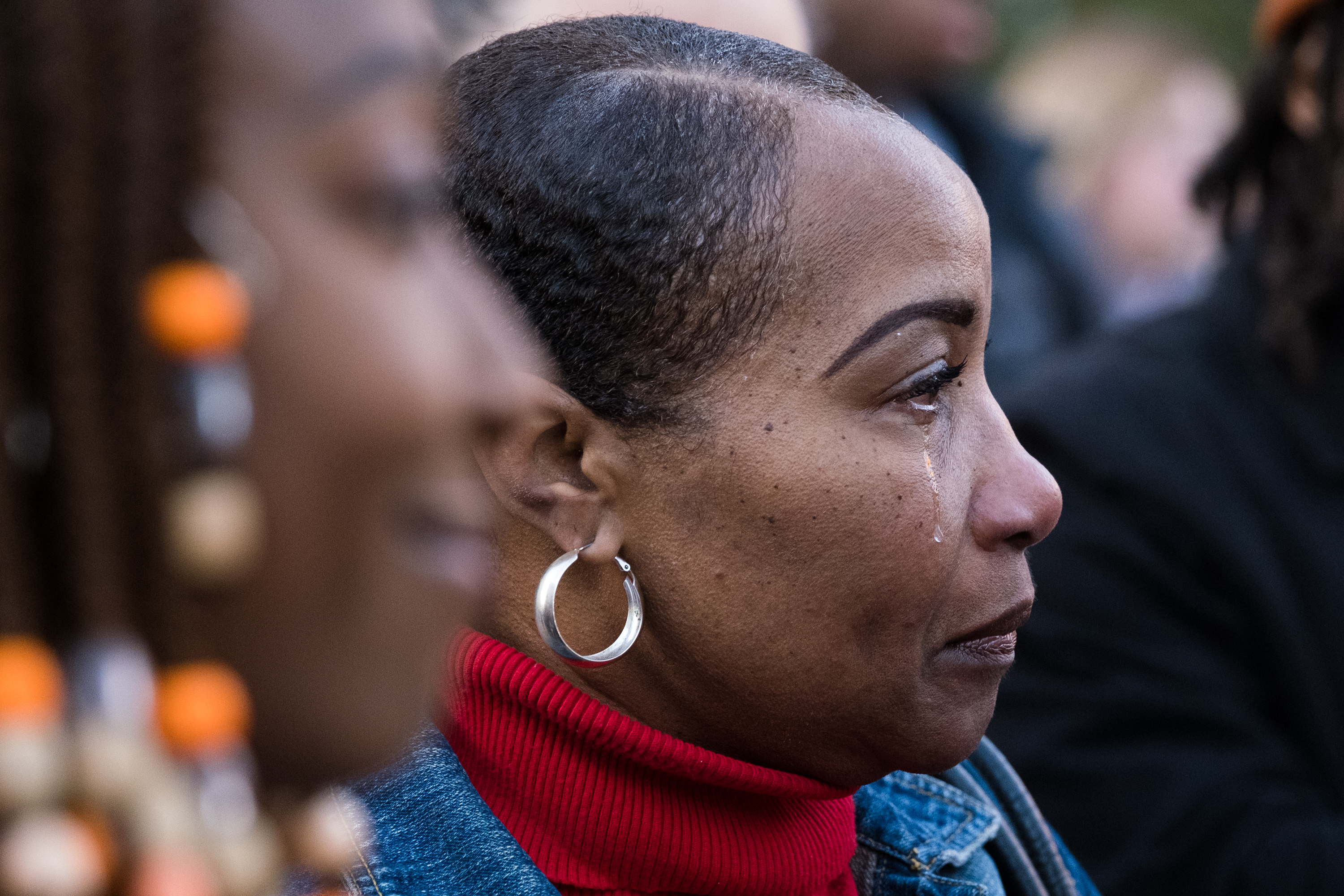 A family member of James Cates Jr. watches as people lay flowers at a newly installed memorial dedicated to him near the pit area of UNC Chapel Hill.