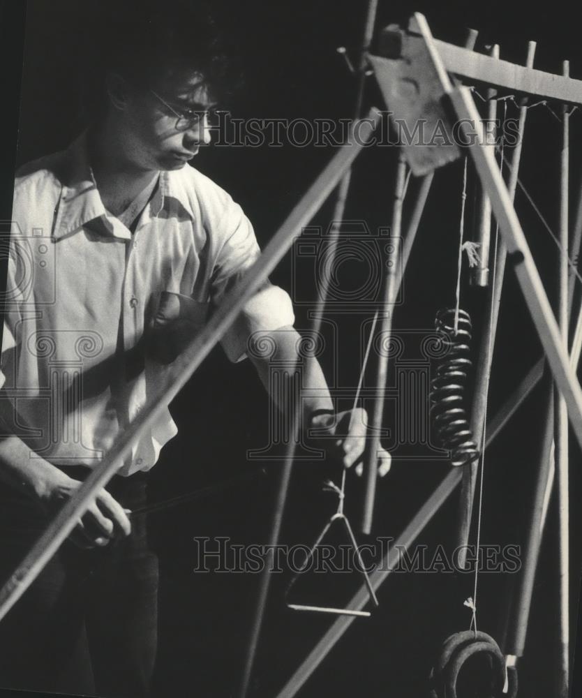 1984 Press Photo James Prinz plays his tubular pipe at University of Milwaukee. This is an original press photo. James Printz performed on his newly invented ...