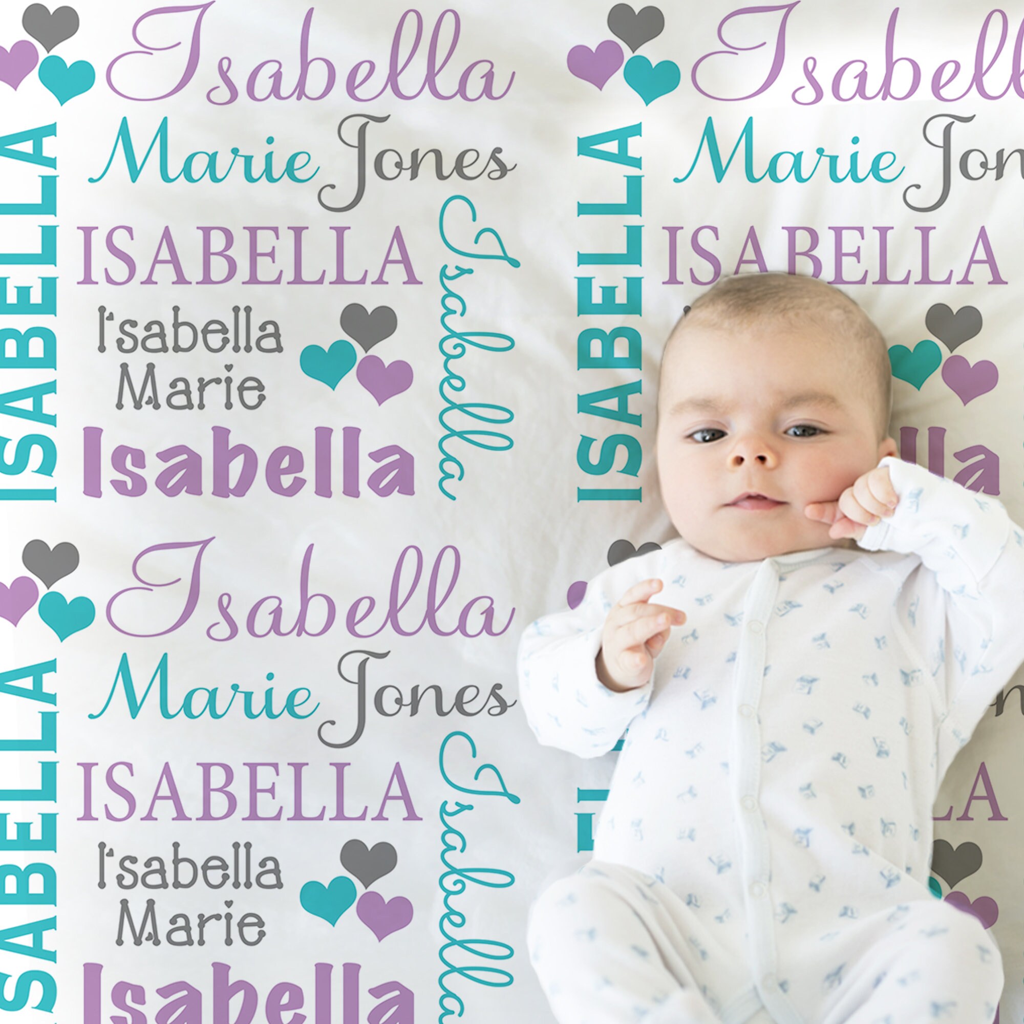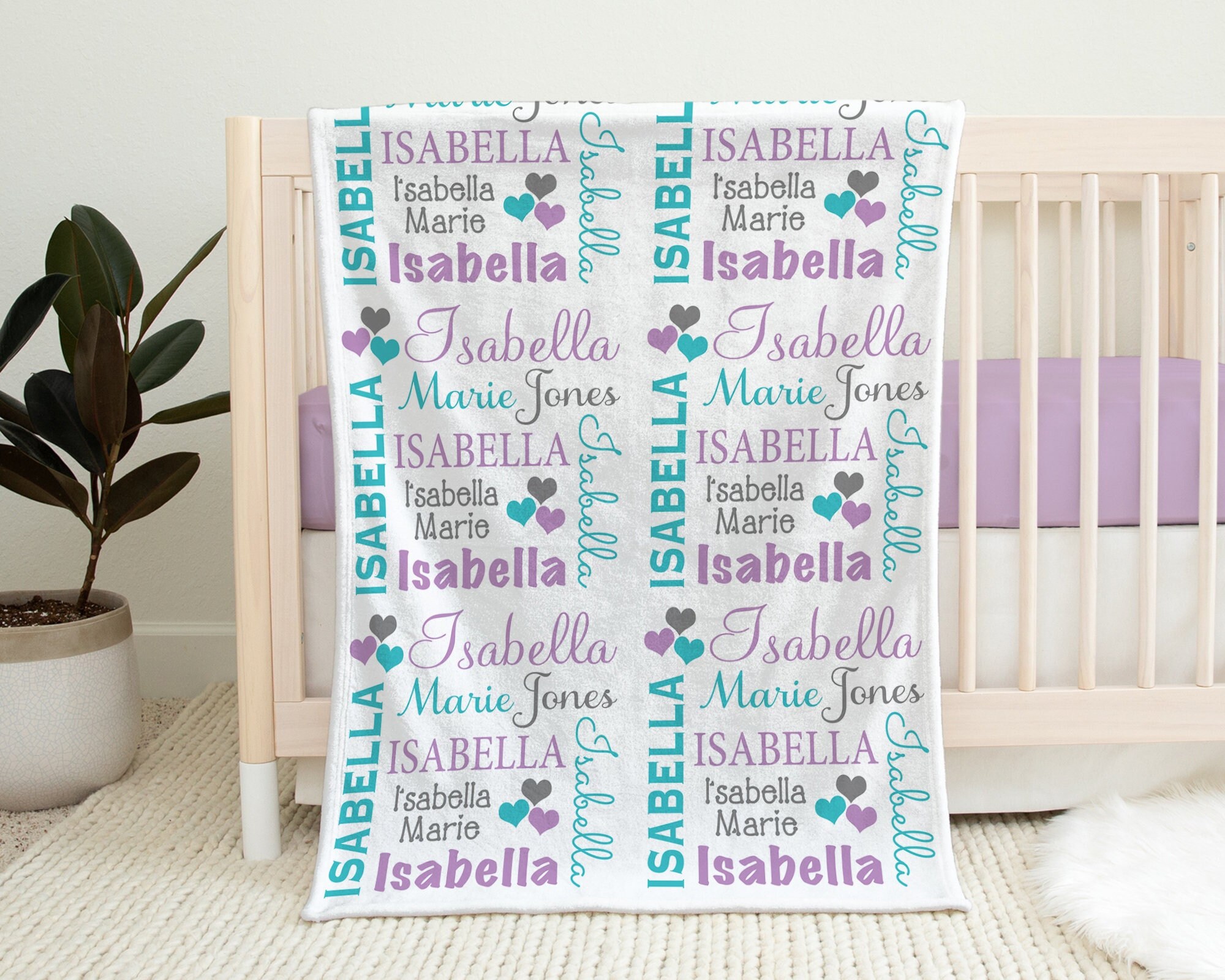 Personalized Hearts Baby Blanket, Baby Name Blanket Purple and ...