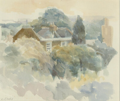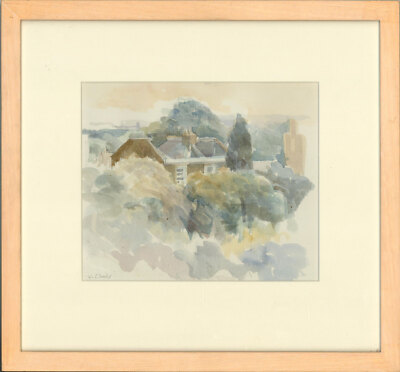 A lovely watercolour painting with graphite in soothing pastel tones, depicting trees in a landscape with the view of a roof by the artist Jeanne Dodd. Well- ...