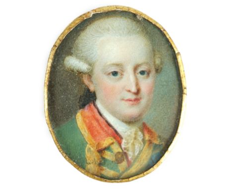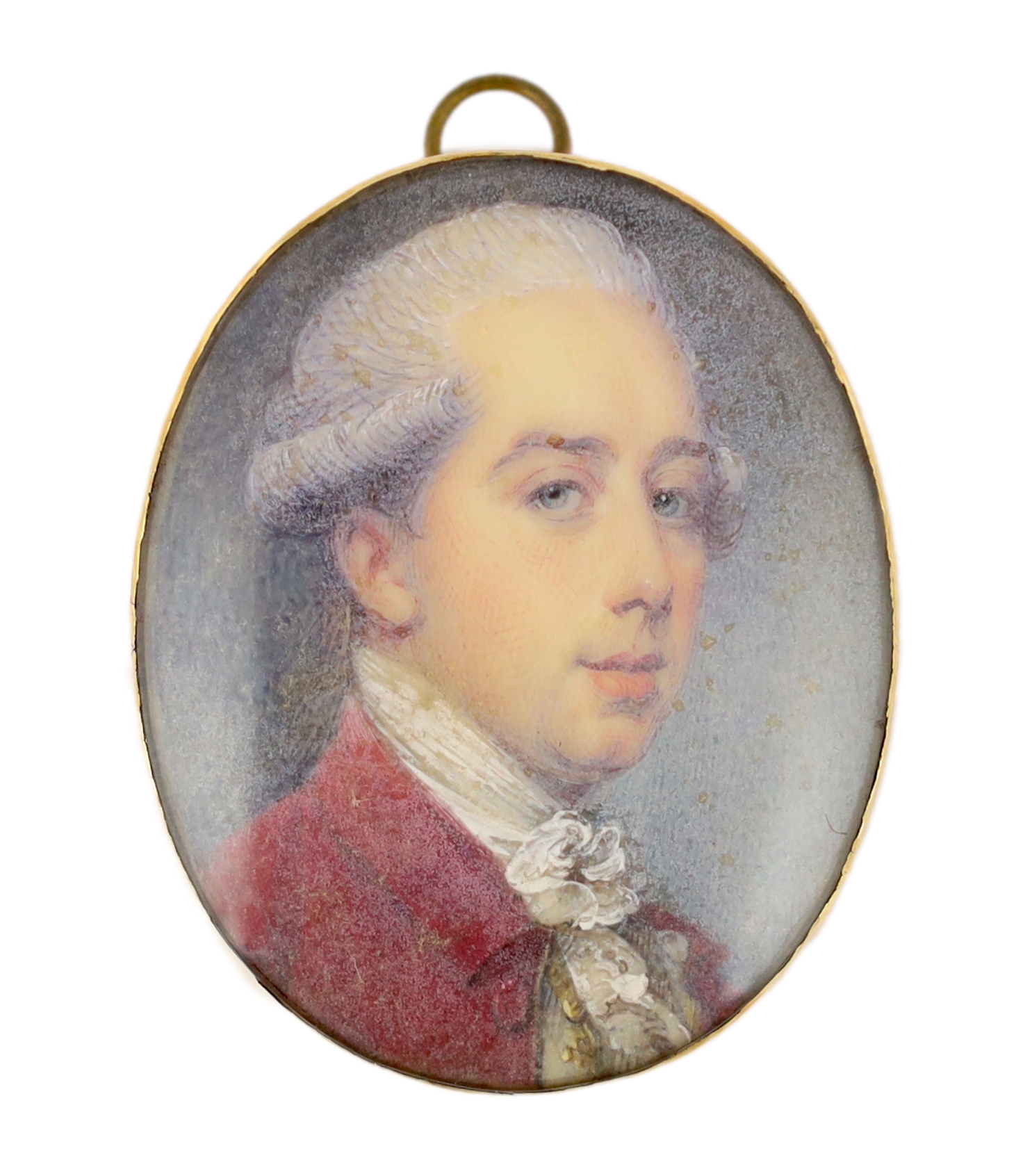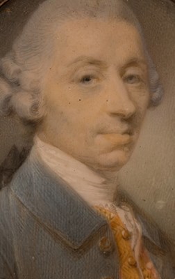 JEREMIAH MEYER, R.A. (ANGLO-GERMAN, 1735-1789) A gentleman, in white coat with blue trim, blue waistcoat and white knotted cravat, powdered hair en queue