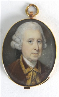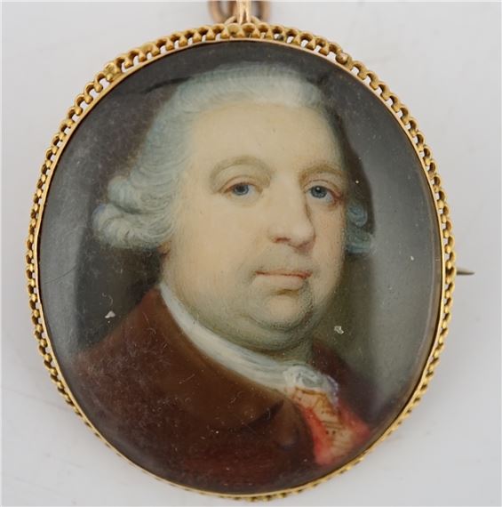 Works by Jeremiah Meyer RA: Portrait miniature of a Gentleman in a plum coat with gold embroidered white waistecoat and lace cravat, his wig powdered and ...