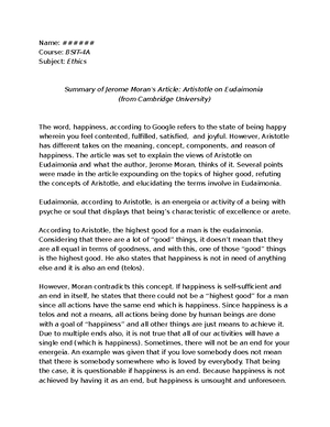 Full Text. Jerome Moran's article 'Aristotle on Eudaimonia (“Happiness”)' in Think 17(48) (2018) focused on Aristotle. In this ...