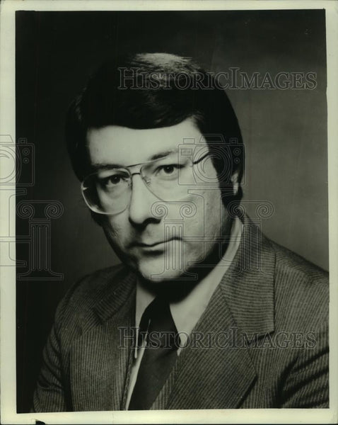 Photograph of Jerry Taff appearing on a television screen. He is looking towards the camera and sitting in front of a background with words that are cut off.