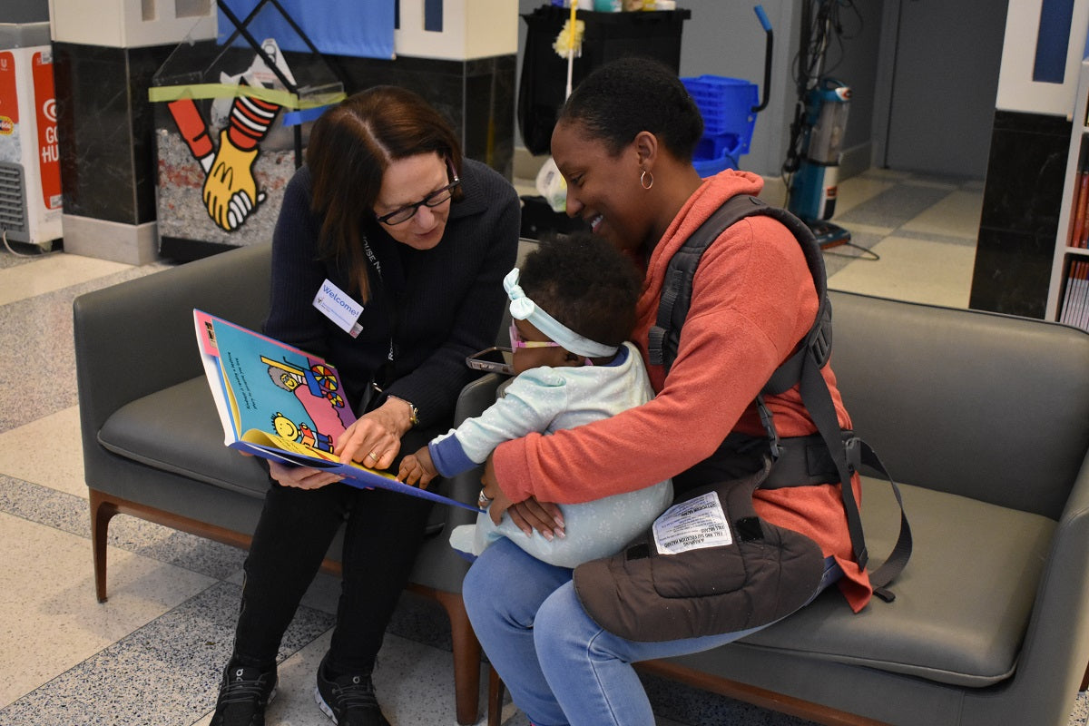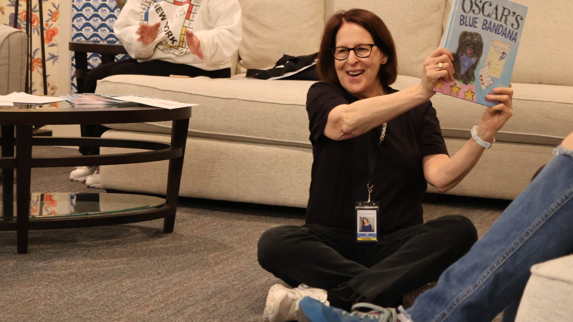 Jill reading a story to a kid in the lobby of the House. Some of those titles include: It's Okay to Be Different; The Feelings Book; The ...