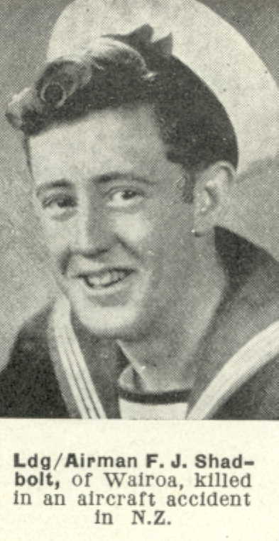 Leading Airman FREDERICK JOHN SHADBOLT ; Regiment & Unit/Ship. Royal New Zealand Navy. H.M.S. Seaborn ; Date of Death. Died 17 November 1944. Age 21 years old.