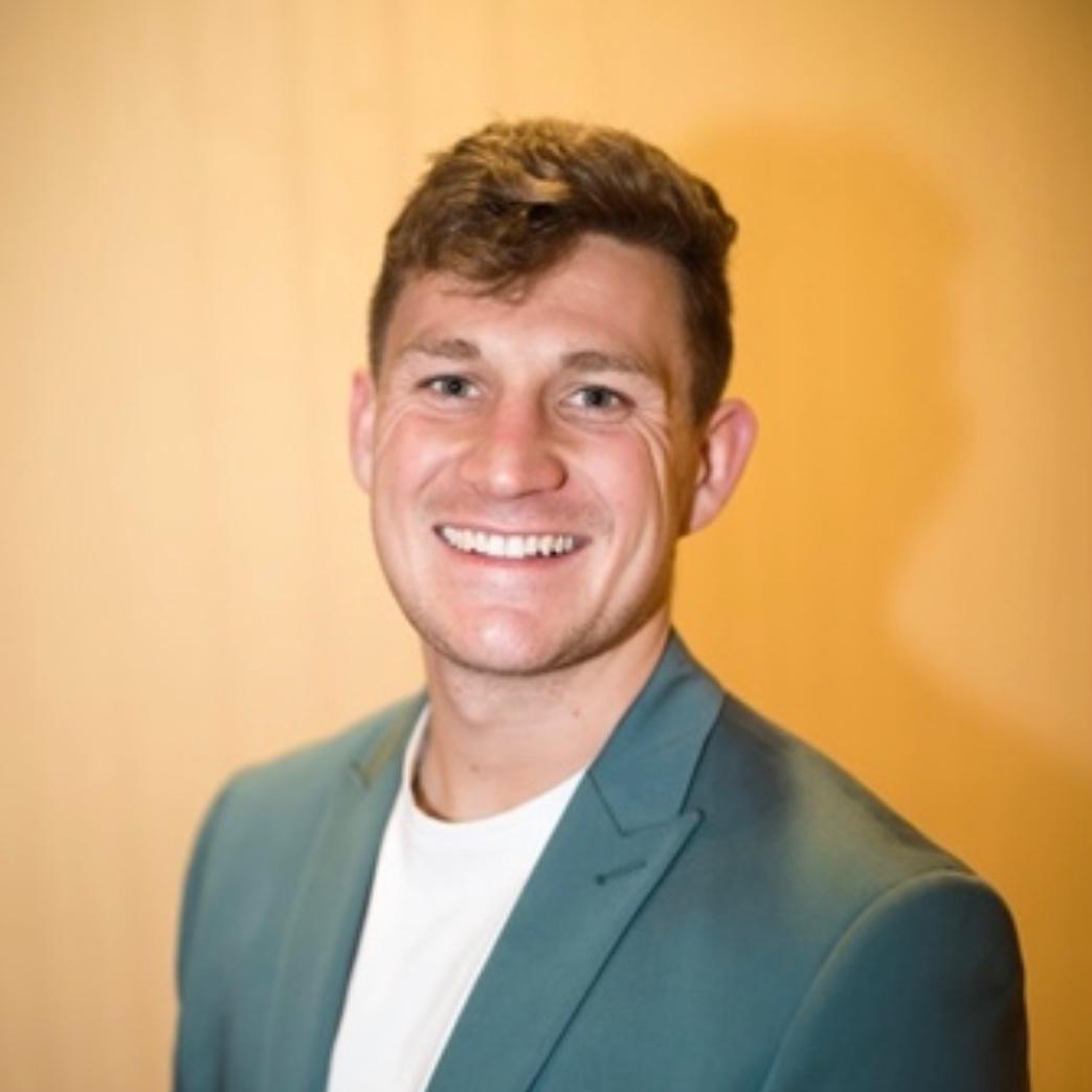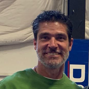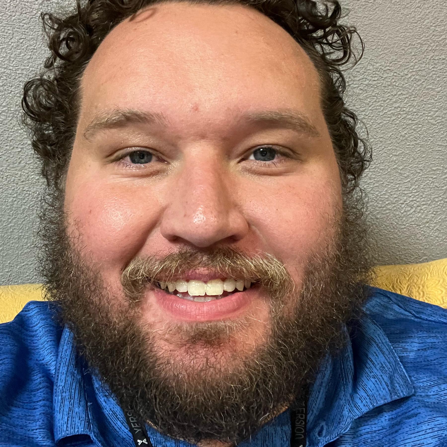 Jonah Carlson smiling with short brown wavy hair and a vibrant blue button-down shirt. Jonah H. Carlson. Student Services Manager, UWW Interdisciplinary Studies.