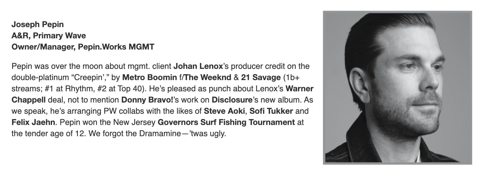 We're thrilled to announce that Joseph Pepin, A&R at Primary Wave and Owner/Manager of Pepin.Works MGMT, has been recognized by HITS Daily ...