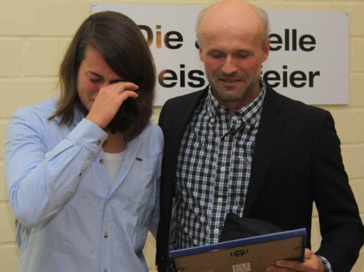Judith Sievers of Germany celebrates her first place in the Junior...
