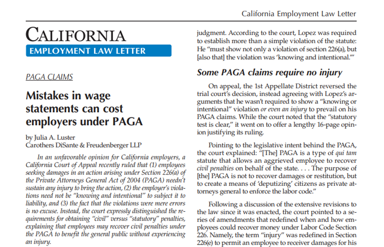 Mistakes In Wage Statements Can Cost Employers Under PAGA - by Julia Luster for California Employment Law Letter Oct 16, 2017. CDF attorney Julia A. Luster ...