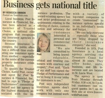 A 3 rd Generation Florida native, Kathy Post grew up in St. Lucie County and is Owner and CEO of Post Insurance & Financial, Inc.