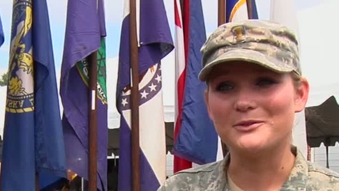 2nd Lt. Kelsey Daoust talks to a military reporter about the deployment ceremony for the 311th ESC. Also available in high definition.