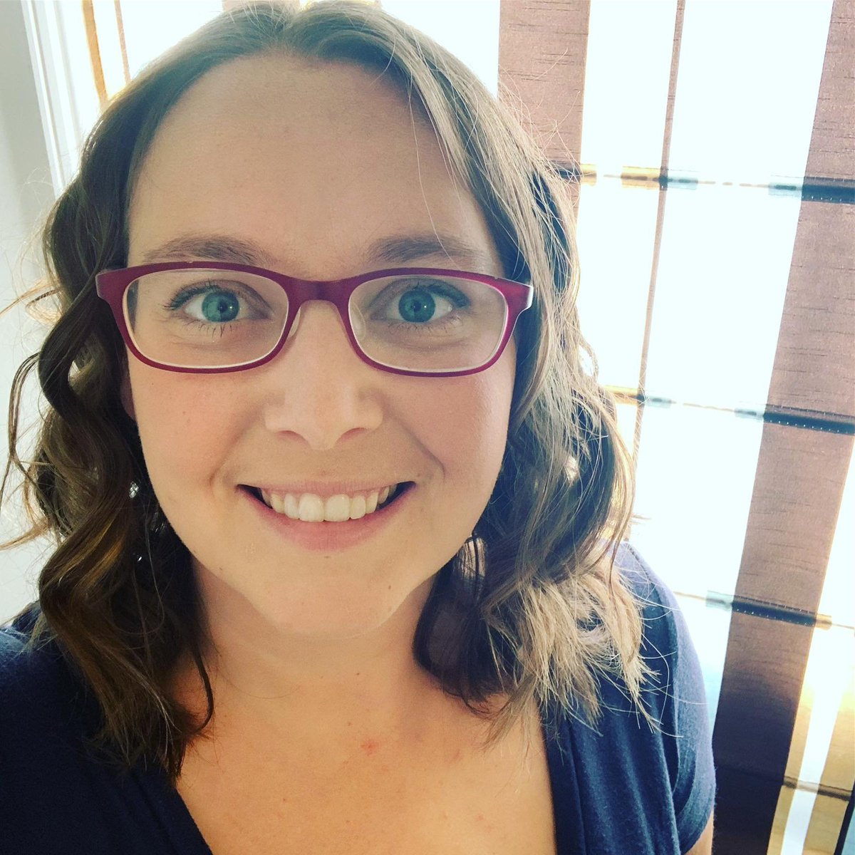 FamilyPreneur-Meg-Brunson-EIEIO-Marekting-Pinterest-Krystal-Snider. Krystal Snider is smiling and wearing a blue top with magenta glasses.