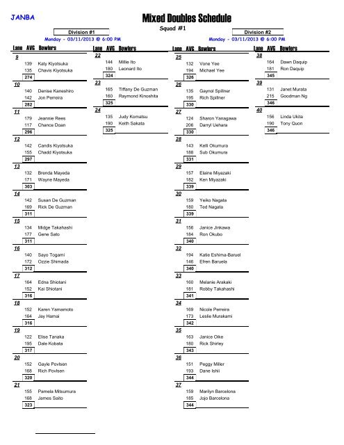 Andrae Lara and Kyle Nagamine, 398, 326, 385, 1109. 105, Ryan Van Hecke and Jennifer Churchill, 384, 382, 343, 1109. 106, William Jackson and Casey Lofthouse ...