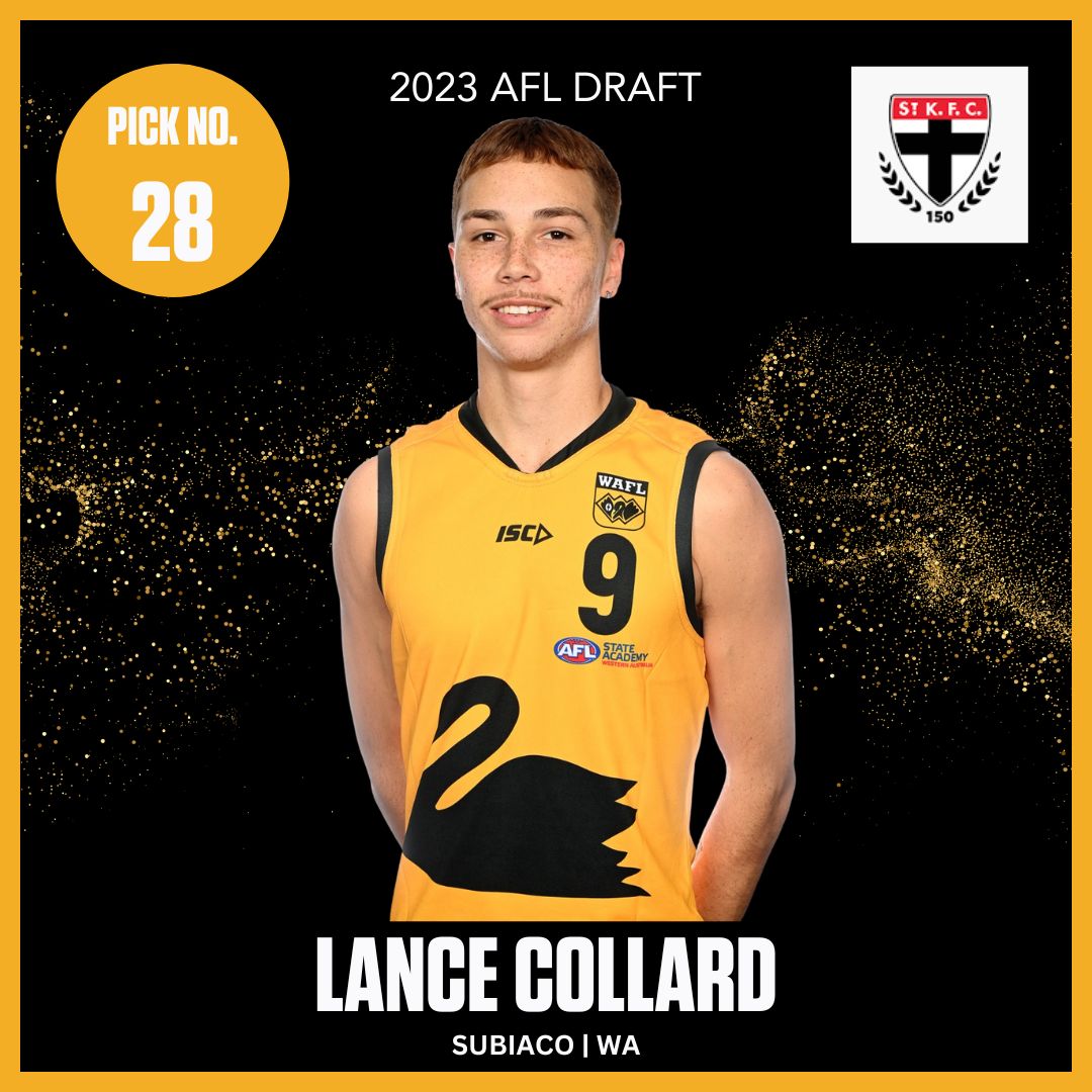 Lance Collard. #4 St Kilda Saints. Age, : 19yr 11mth. Born, : March 26, 2005. Height, : 185cm. Weight, : 65kg. Position, : Forward. Contracted Till, : 2027.