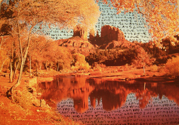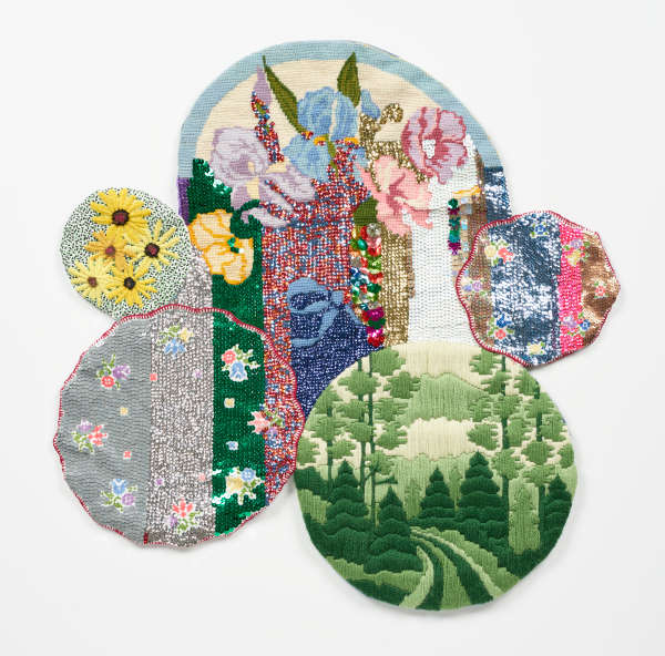 Artist Larry Krone's Then and Now includes an unfinished needlepoint piece found in a Michigan thrift store, linens embroidered by his great-aunt Esther, ...