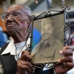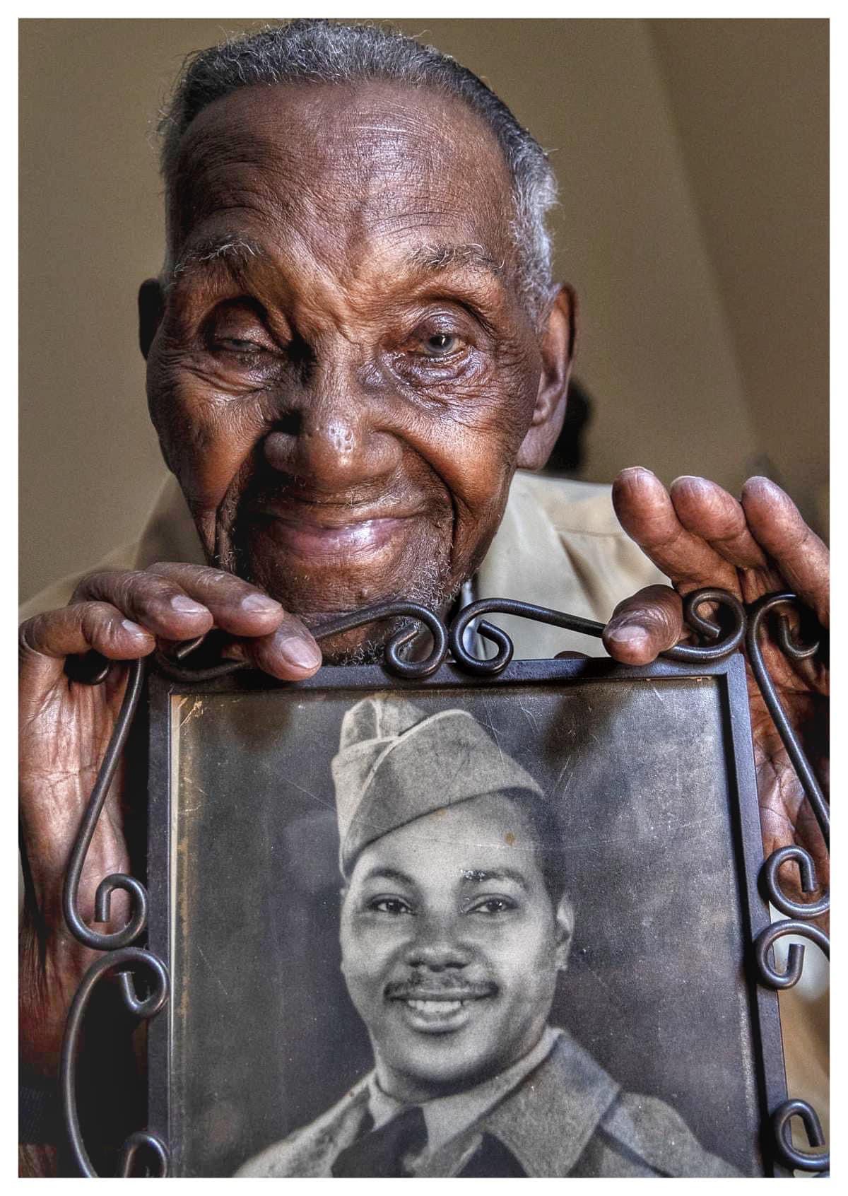 ... Lawrence Brooks holds a photo of him taken in 1943, as he celebrates his 110th birthday at the National World War II Museum in New Orleans ...