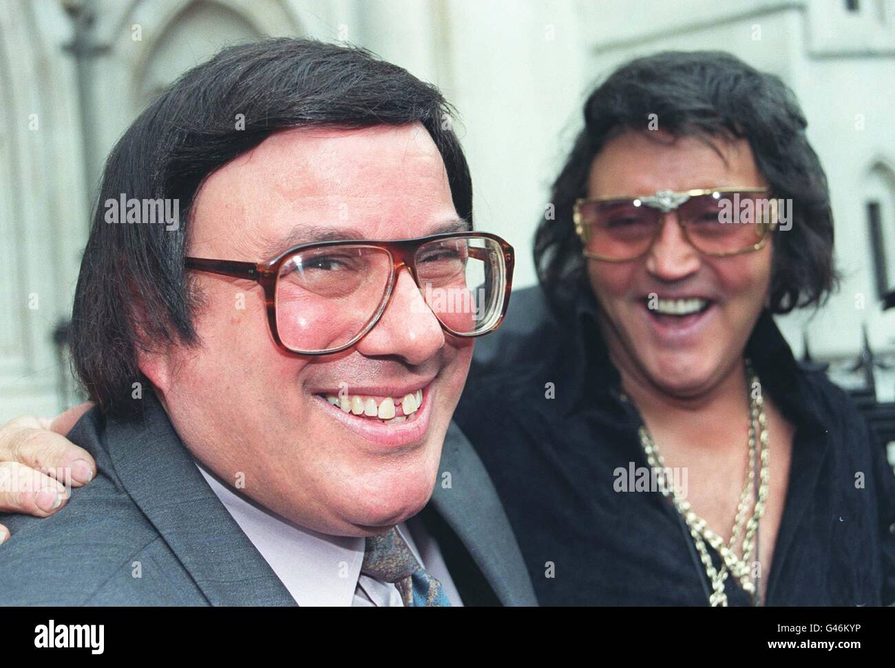 Sid Shaw celebrates with Elvis impersonator Leighton Summers (right) after winning the right at London's high Court to use the Elvis Presley name at his ...