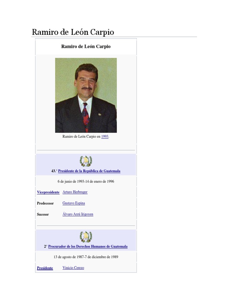 Ramiro de Len Carpio (Ciudad de Guatemala, 12 de enero de 1942 Miami, 16 de ... Ramiro de Len Carpio muri el 16 de abril de 2002 en la ciudad ...