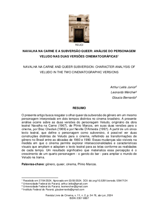 O presente artigo busca resgatar o olhar de gênero de Levi Salgado em sua filmografia, dando ênfase na análise dos masculinos em sua primeira fase criativa, ...
