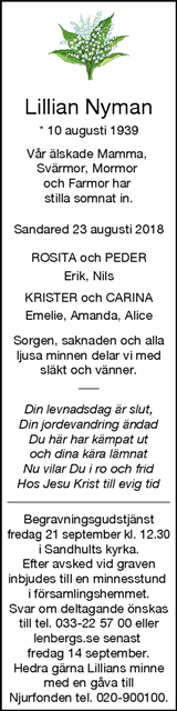 LILLIAN NYMAN. Begravning. Begravningsgudstjänst fredag 21 september kl. 12.30 i ... Detta minnesrum är skapat via: Tillbaka till sökresultatet. LILLIAN NYMAN.