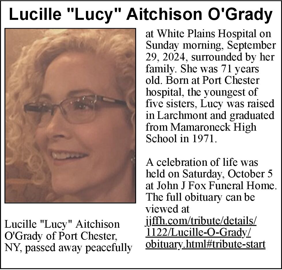 Lucille “Lucy” Aitchison O’Grady, of Port Chester, NY passed away peacefully at White Plains Hospital on Sunday morning, September 29, 2024, surrounded by her ...