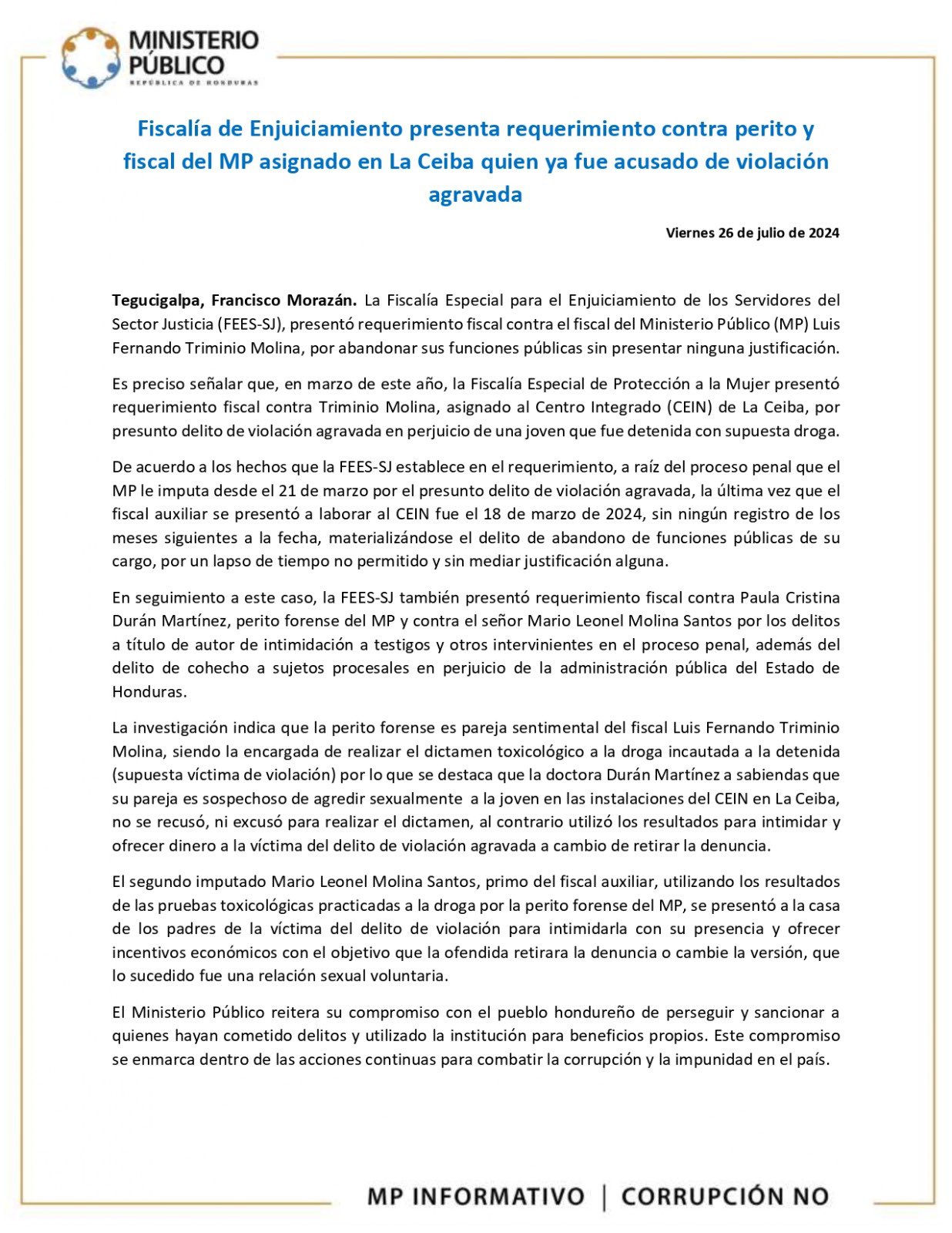 De fiscal del MP a tener alerta migratoria por violación - El Heraldo