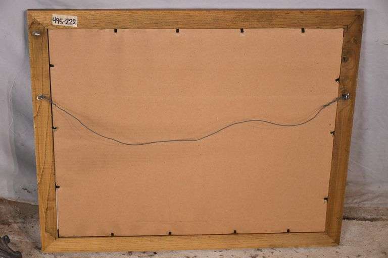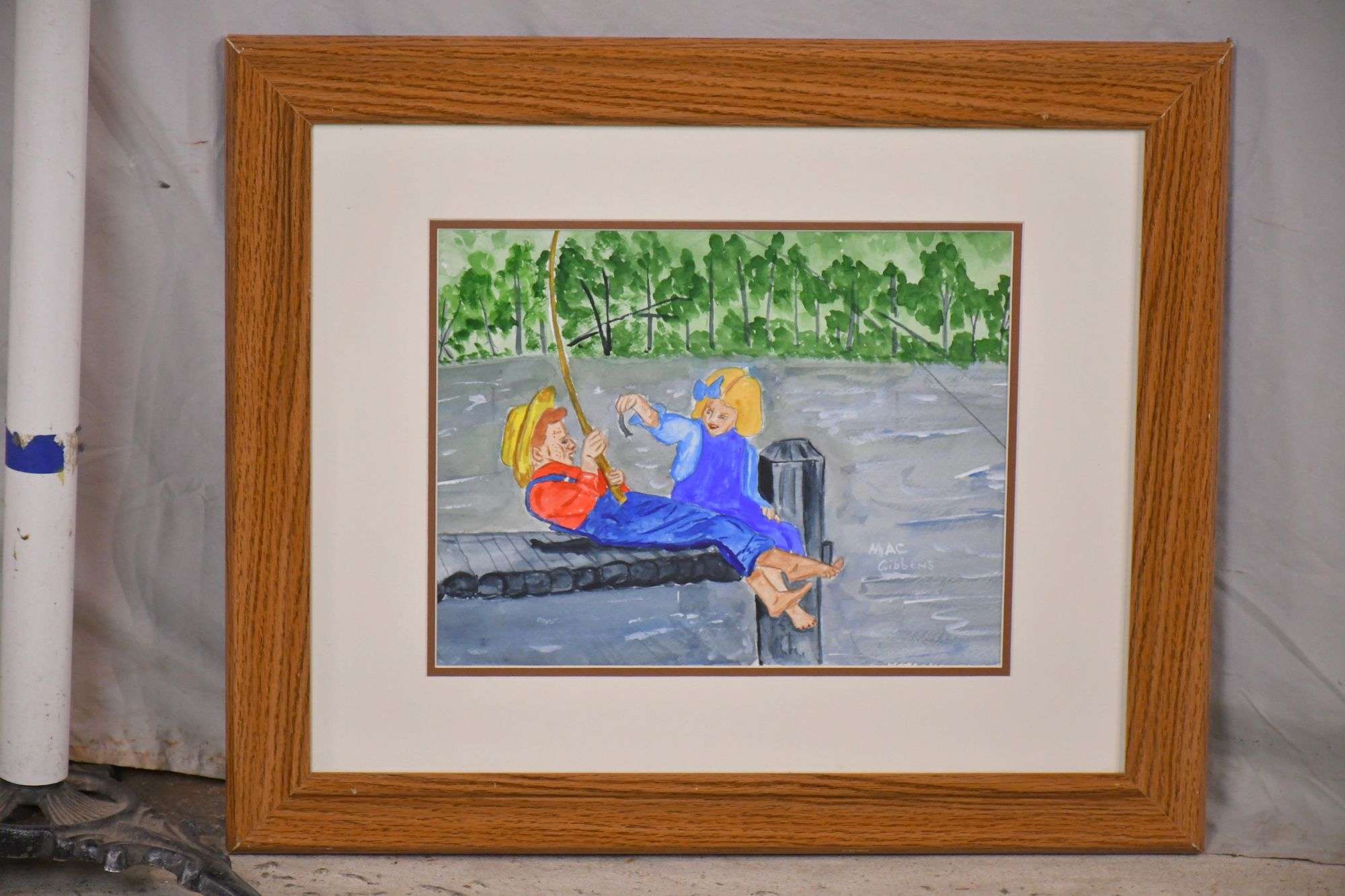 Small framed watercolor of boy and girl fishing by Mac Gibbons; 495-230 - oak frame - 23.5x19.75.