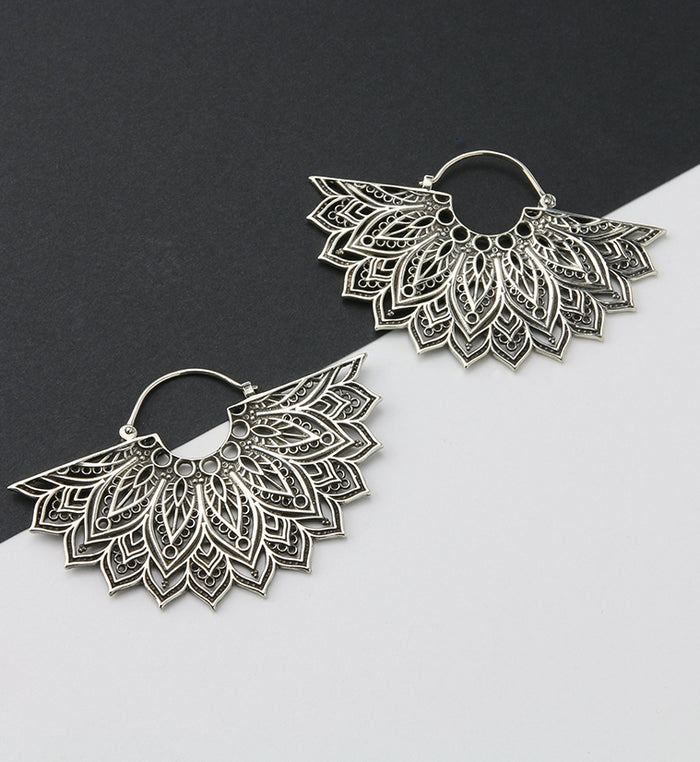 Half Manda White Brass Ear Weights ... White brass half flower designed ear weights. Size 18G so must be 18G or bigger to wear. These weigh about 18 grams each ...