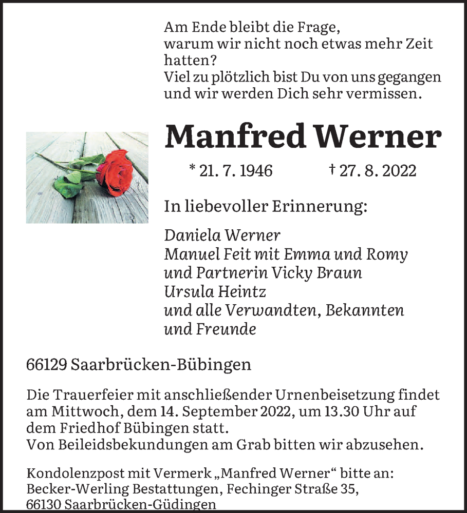 Manfred Werner Ullman. 1951 - 2021. Tribute Wall. Obituary · Tribute Wall · Memories · Donations. Share / Subscribe to this tribute. Share Obituary: Click here ...