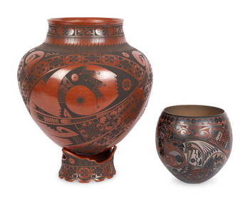 The two carved pots are both signed by artist Manuela Olivas are each worth $20-$60, as I was able to figure out that much online.