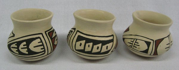 Three Miniature Mata Ortiz Pots by Manuela Olivas, largest 1.75''H x 1.75''D, traditional Paquime' inspired designs and.