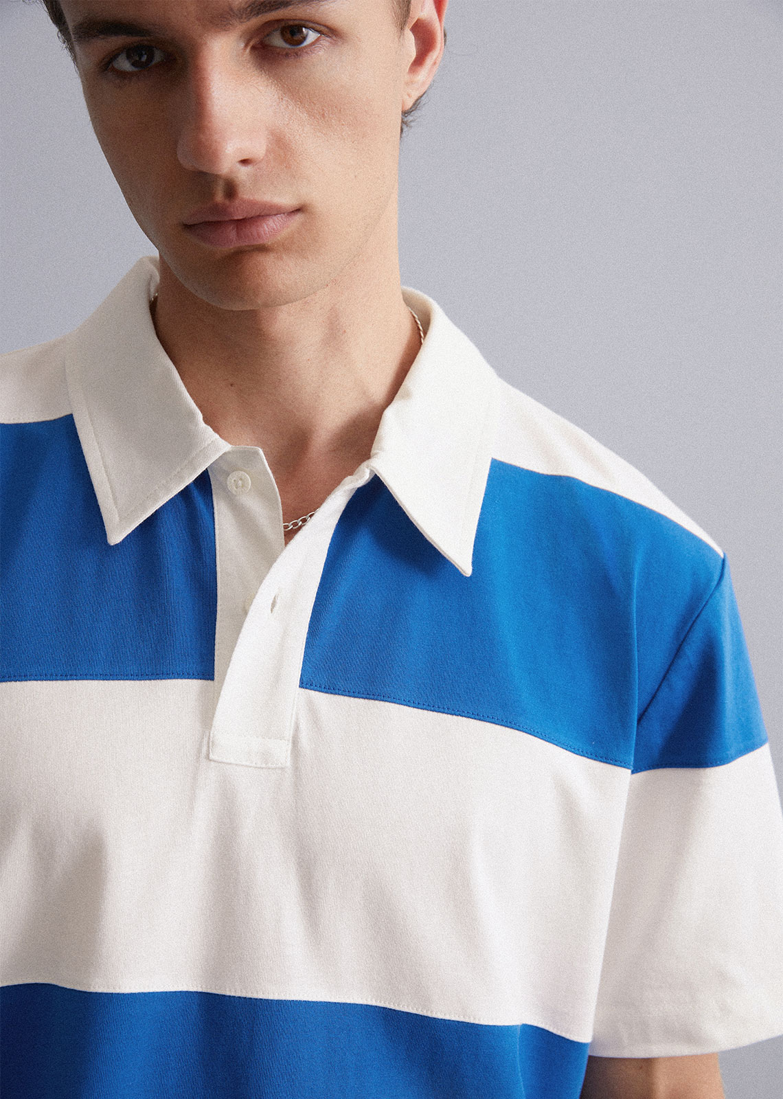 Casual style; Button placket; Slim fit; Polo neck; Pique jersey; Short sleeves. Model is wearing: Size M. Fabric: 100% Cotton.
