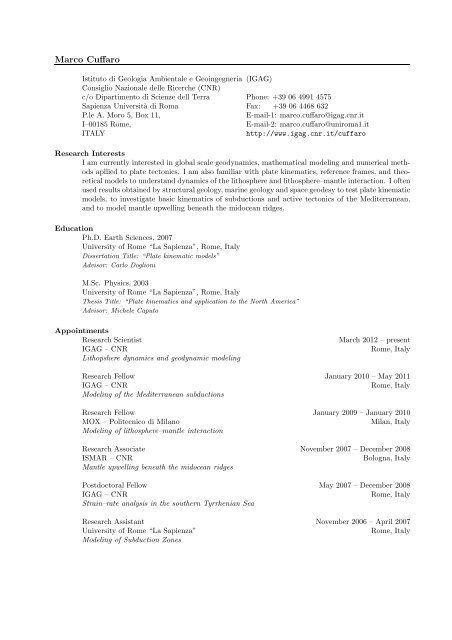 Marco Cuffaro. 0649914928. marco.cuffaro@igag.cnr.it. Senior researcher. Rome Unit - Dipartimento di Scienze della Terra – Università Sapienza – Roma.