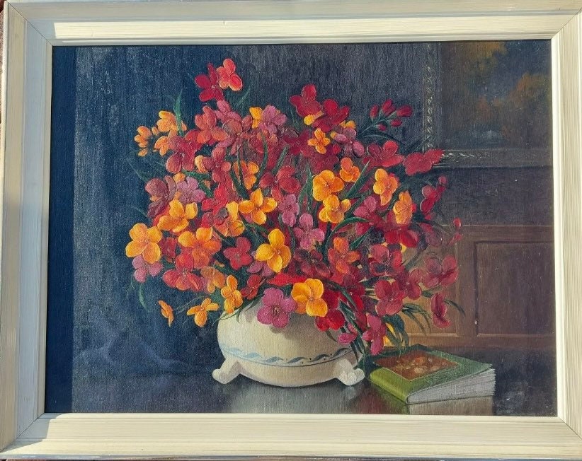 Still life Vintage original Oil Painting Flowers 'Deep Dahlias' by Marjorie Lance.