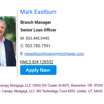 Mark Eastburn - Canopy Mortgage · Map · 5335 Meadows Rd. Ste 470. Beaverton, OR 97005. Directions · (503) 445-0445. Call Now · More Info. Hours · Payment methods.