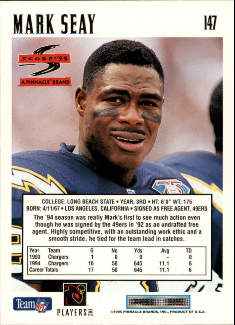 Mark Seay played 5 seasons for the Chargers and Eagles. He had 135 catches for 1,629 yards and scored 10 touchdowns.