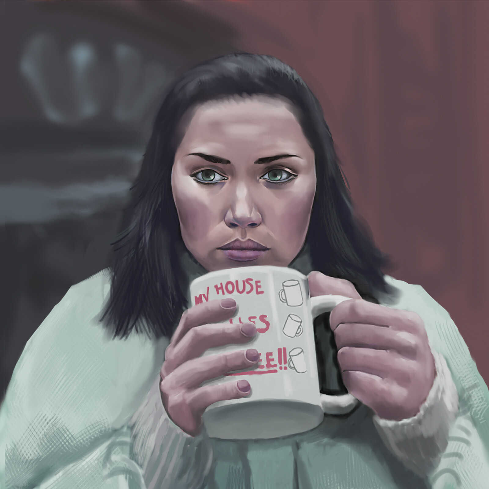 This art piece by Ryan Thomas-Palmer shows Marta, the protagonist, in the reflection of a knife, holding a mug that reads “My house, my rules, my coffee.”. “Knives Out” …