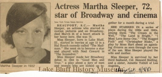 The multi-talented Martha Sleeper was born in Lake Bluff in 1910. Her family probably lived with her uncle John J. Murdock, a big name in vaudeville who went on to run RKO Pictures. Martha …