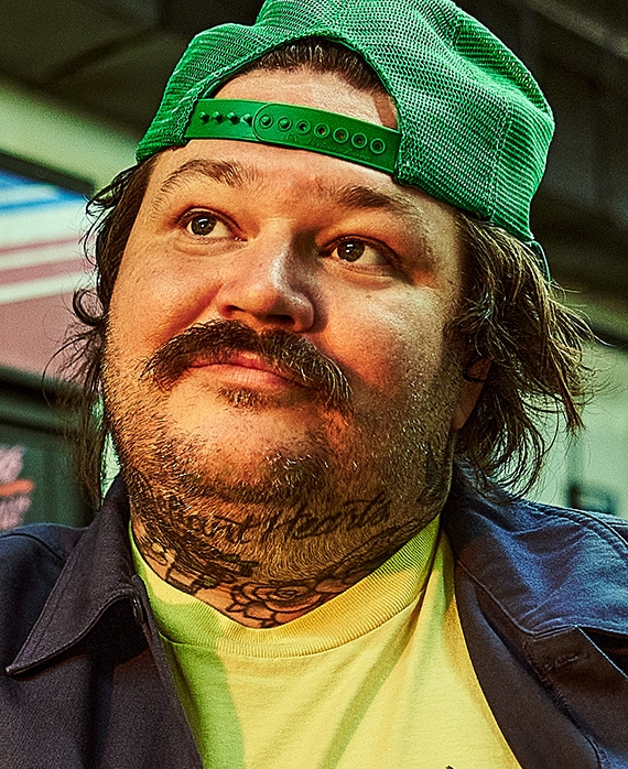 Matt Matheson stand in red baseball cap standing in front of an open fridge. Matty Matheson. Photography, Aaron Wynia. food news. Matty Matheson shares the ...