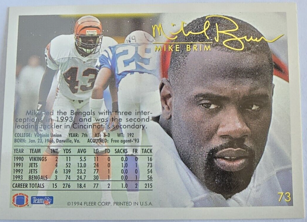 Michael Brim played 8 seasons for 5 teams, including the Bengals and Jets. He played but didn't record a tackle.